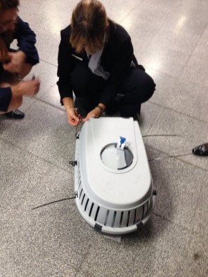 Comme ça ne m’avait pas été communiqué, je me suis présentée avec une cage en plastique conventionnelle, et pour la mettre sur l’avion elles ont dû la remplir de pinces en plastique pour la rendre plus sure. KLM est une compagnie merveilleuse pour le traitement des animaux, même si elle est plus chère que les autres. J’ai dépensé 350 euros pour Grigiotta, 200 pour le billet et 150 pour le traitement en transit à Amsterdam (où ils ont un hôtel pour animaux dans l’aéroport !). Ils l’ont certainement bien traitée car quand je l’ai retrouvée, à la fin du vol, ils avaient placé à l’intérieur de la cage, sur la porte, une petite tasse avec de l’eau.