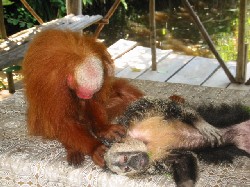 You continue your visit accompanied by a cheerful and loving group: Chavo is a Red Uakari monkey, an endangered species found in the Amazon forests only, and arrived to Pilpintuwasi hardly malnourished and with a fractured foot, due to a fall when his mother was shot. You then have Florian and Zecke, two Saki monkeys, both on the verge of dying of malnutrition when they arrived to Pilpintuwasi, and that now go up and down the trees and yourself incessantly. You then have the more recent acquisition, Tony, a Capuchin monkey that used to live with street children. When he got sick one day a tourist pitied him seeing that he was almost unable to hang on to a little boy’s neck. The guy noticed that the animal was sick, and so he gave the children some money (though he shouldn’t have done that!!!) and left the animal at Pilpintuwasi. Tony had a terrible diarrhea, so Gudrun took him to the vet, that took some analysis: the poor little monkey had three different kinds of parasites, but after the treatment he started developing very well again. A curious thing about Tony is that he seems to have been trained to steal already: when people with earrings arrive at Pilpintuwasi, Tony gets on them immediately and takes away their earrings, he perfectly knows how to open the common ones.
