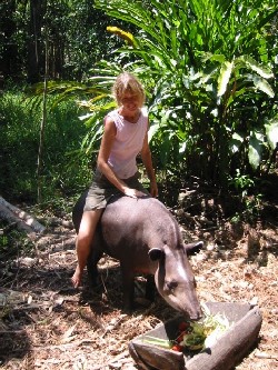 You then arrive to Lolita, a lovely tapir whose story is also very sad: people that killed her mother tried to raise Lolita. In order to avoid that she runs away, they tied her paws with a nylon string. When the animal got to the point of being unable to stand because of the wounds the nylon had inflicted upon her, the “owner” offered her to Pilpintuwasi. Lolita is vegetarian, and it is a real joy to see her eating her huge papaya after Gudrun has climbed on her big back.