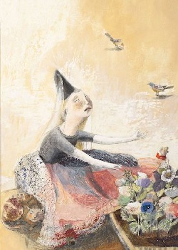 Sì, si chiama “Giardino d’inverno” ed è quello che sto per illustrare ora. Sono già due anni che l’ho scritto e mi piaceva così tanto che ho fatto altri libri prima di questo solo per portarmi ad un livello grafico più maturo e sentirmi in grado di illustrarlo. E’ la storia di una principessa chiusa in un giardino d’inverno. Se fuori tutto è di ghiaccio dentro il giardino si può stare vestiti di lino, talmente l’aria è tiepida. Il giardino rappresenta il mondo interiore, ricco di fantasia e tranquillità, ma se non si vuole uscire fuori, nella neve e nel ghiaccio (se non si vuole rischiare), il prezzo da pagare è quello della solitudine.
