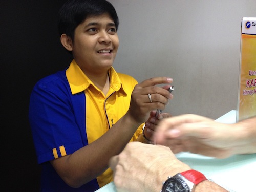 Selezionate il vostro provider, inserite il numero, la cifra che volete ricaricare, e date ok prima di passare a pagare in cassa (contanti o carta di credito). Semplice e immediato. Potete anche usare i vari punti nei mall. Per dire che volete ricaricare, dovete usare l’espressione “Top up”, “Pulsa” in indonesiano.