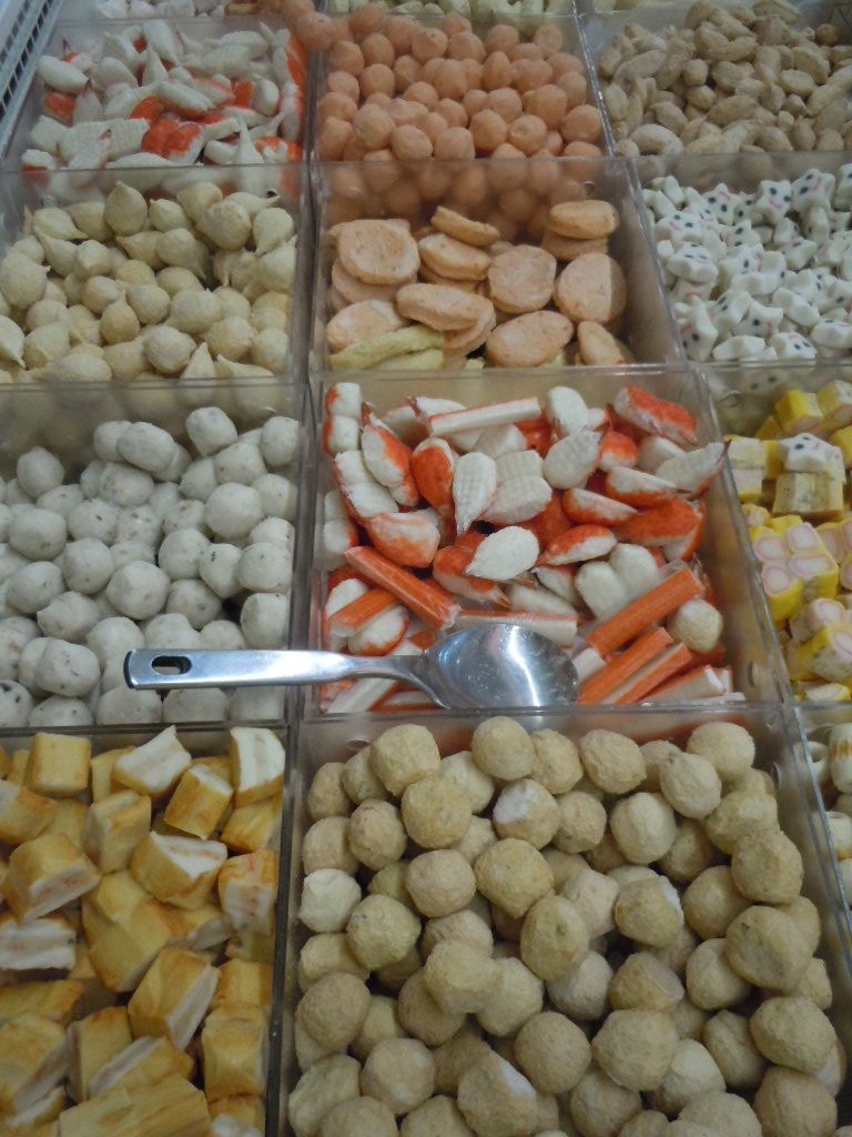 All’inizio ho pensato che fossero caramelle, ma mi sono accorta rapidamente che erano congelati. Poi ho visto il cartello che diceva “snack di pesce” e ho capito che quelle belle faccine e palline colorate altro non sono che spuntini fatti di pesce. Mi auguro solo che mantengano quei bei musetti e i bei colori anche fritti!