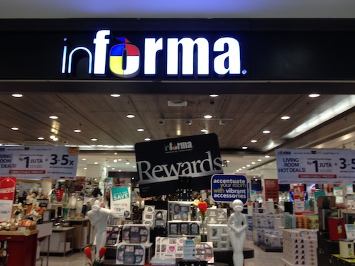 Questo è un negozio che ho scoperto in realtà tanto tempo fa, quando davo gli ultimi tocchi alla mia casa. Informa (https://informa.co.id) è un grande magazzino che vende mobili e attrezzature per la casa. Ammetto che alcune delle cose che propone sono un po’ da brivido, ma altre invece vi aiuteranno a risolvere molti problemi. Il reparto sedie, divani e tavoli è super fornito. E’ come una piccola IKEA ma senza bisogno di farvi il viaggione – Informa si trova infatti in tantissimi mall a Jakarta…