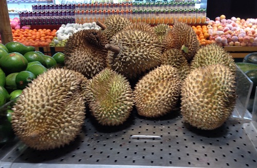 Ho finalmente incontrato dal vivo il signor Durian! Il Durian è un frutto terribilmente puzzolente che si trova da queste parti, e che è addirittura proibito in alcuni luoghi pubblici perchè appesta l’aria. E in effetti confermo che anche da lontano, emette una puzza insopportable. Non so come la gente trovi il coraggio di mangiarlo (c’è un episodio molto divertente sul durian in Forced to Fly, il libro che abbiamo discusso il mese scorso…). Comunque sia, è importante sapere che esiste quantomeno perchè ha dato a Jakarta uno dei suoi soprannomi più diffusi: Il gran durian (chissà perchè…? 🙂 ) Eccolo: