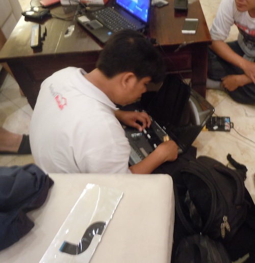 Ieri era domenica e un bicchiere d’acqua si è tragicamente rovesciato su uno dei nostri computer, che ovviamente conteneva documenti importantissimi senza back-up, e da usarsi assolutamente il giorno dopo. Vi lascio immaginare la tensione. Ci siamo precipitati in internet e abbiamo provato tutte le possibili combinazioni di ricerca: “pc+repair+urgent+jakarta“, “sos+computer+jakarta“, “computer+technician+jakarta“, etc. Solo quando mio marito ha avuto la brillante idea di usare “24 jam”, che significa 24 ore, siamo arrivati su una (modesta) lista di siti web che sembravano avvicinarsi a quello di cui avevamo bisogno. Abbiamo chiamato uno dei tipi che appariva su uno di questi siti, e abbiamo subito capito che non c’era una sola lingua comune tra noi che ci permettesse di spiegare l’intricato problema. Questa volta però è stato lui ad avere la bella idea di dirci “address sms” – e una volta che gli abbiamo mandato il nostro indirizzo, lui ci ha risposto (sempre via testo) in Bahasa, ma a quel punto eravamo pronti con Google Translator (come cavolo facevamo a sopravvivere prima???) e siamo riusciti ad avere una complessa e intensa conversazione che ha incluso dati come l’ora attesa d’arrivo, livello di capacità, urgenza, etc. Poi è arrivato (in realtà erano due, ma mi sembra che l’altro fosse qui solo per supporto morale), ha aperto e smontato il computer, l’ha asciugato, riassemblato, ed ecco che funzionava di nuovo, anzi, meglio di prima. Ah, ed era domenica (questo l’ho già detto), è venuto a domicilio e ci è rimasto due ore, dando, già che c’era, una pulitina a un altro computer che era molto lento: il tutto per sole 400,000 rupie (26 euro). Quindi, se mai sarete a Jakarta e il vostro computer avesse un problema, chiamate Hay – Smartcom, tel. 021 96371994 or 0857 19368300 – non solo vi mette a posto il computer a casa vostra, ma vi aiuta anche a migliorare significativamente le vostre nozioni di Bahasa!