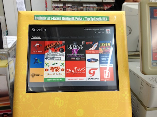 E’ facilissimo ricaricare il cellulare a Jakarta. Basta andare in uno dei tantissimi 7/11 (ce ne sono quasi più delle motorette), e comprare una ricarica sotto forma di tessera, o servirsi di questo simpatico schermo: