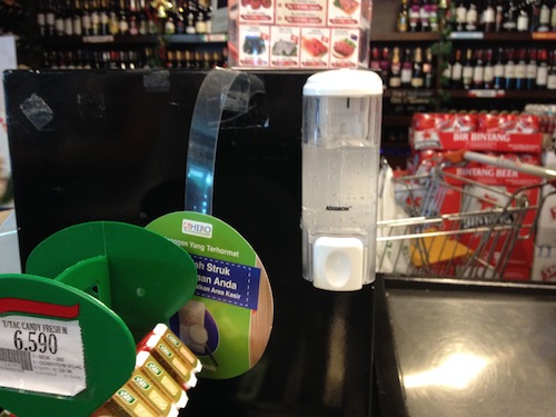 Qui il gel igienizzante per le mani va per la maggiore. In un ambiente altamente umido come quello di Jakarta, l’igiene è importantissima. Lo vendono in piccole bottigliette di plastica, e si trova nelle auto, negli uffici, nei ristoranti, nelle case e nelle borse delle signore. Questo supermercato ha pensato bene di piazzare un dispenser di gel alla cassa – così quando si finisce con gli acquisti, e dopo aver toccato decine di prodotti, si può uscire dal supermercato con le mani belle pulite e disinfettate!