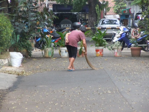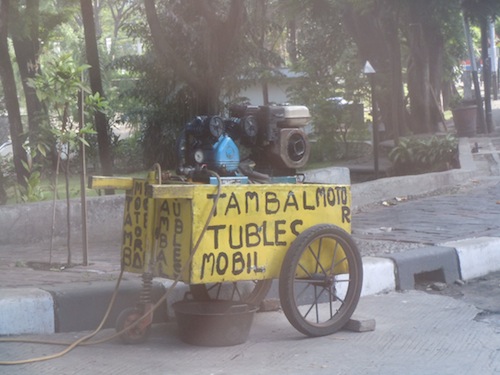 Si tratta di una macchina, un posto, un punto nella città, dove potete fermarvi a gonfiare le gomme, ogni tipo di gomma. Ce ne sono tanti in tutta Jakarta, alcuni più sofisticati, con grandi cartelli e un tettuccio per ripararsi dal sole. Altri Tubles (li chiamano così) sono più semplici, come questo che si trova all’inizio della mia via. Da quanto ho scoperto cosa sono e a cosa servono, mi è presa la mania di cercarli in tutta la città quanto vado in giro. Non trovate che sia un’idea di business geniale???