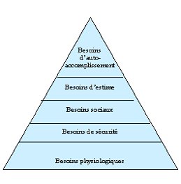 Selon Maslow, tous les individus souhaitent satisfaire cinq catégories de besoins, classables par ordre d’importance, hiérarchie qu’il matérialise par une pyramide.