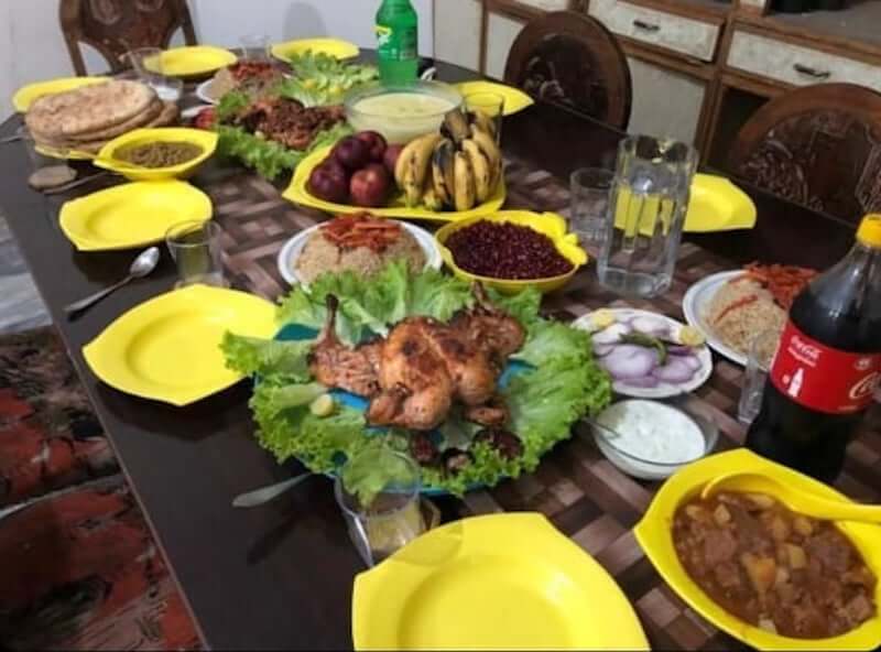 Les femmes cuisinent durant de nombreuses heures afin de préparer tout le festin. En cas de visite ponctuelle et lorsque les hôtes ne sont pas avisés, un plat de riz, du pain et du poulet sont cuits sur le moment et ajoutés au plat cuisiné initialement.