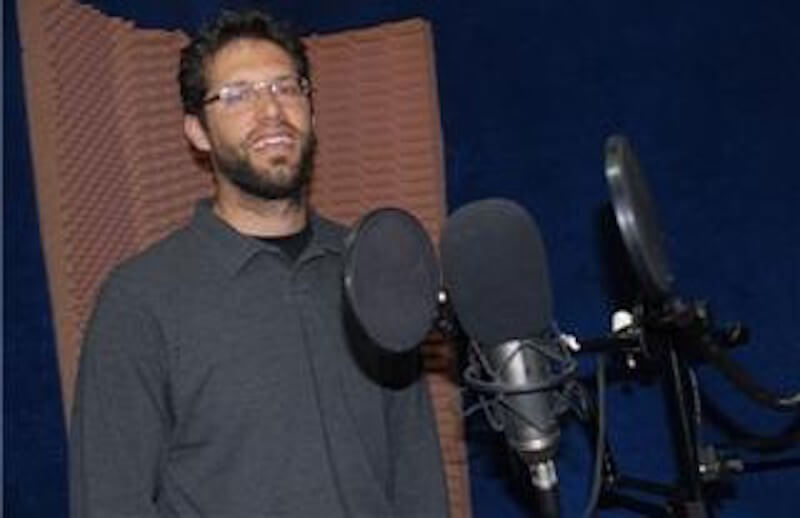 Santiago at the microphone where Radioclips are produced.